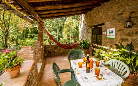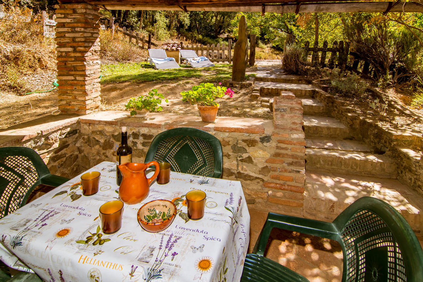 Junto a la entrada de la casa hay una zona ajardinada vallada con una terraza sombreada y amueblada, que ofrece un lugar acogedor para desayunos y otras comidas al aire libre, con la banda sonora del canto de los pájaros o el profundo silencio del bosque.
