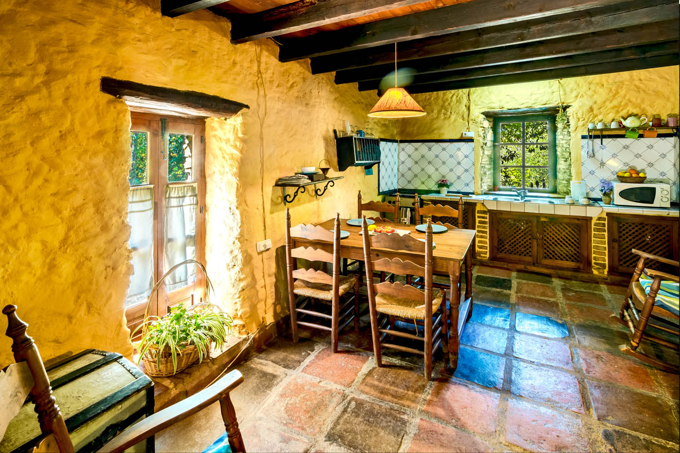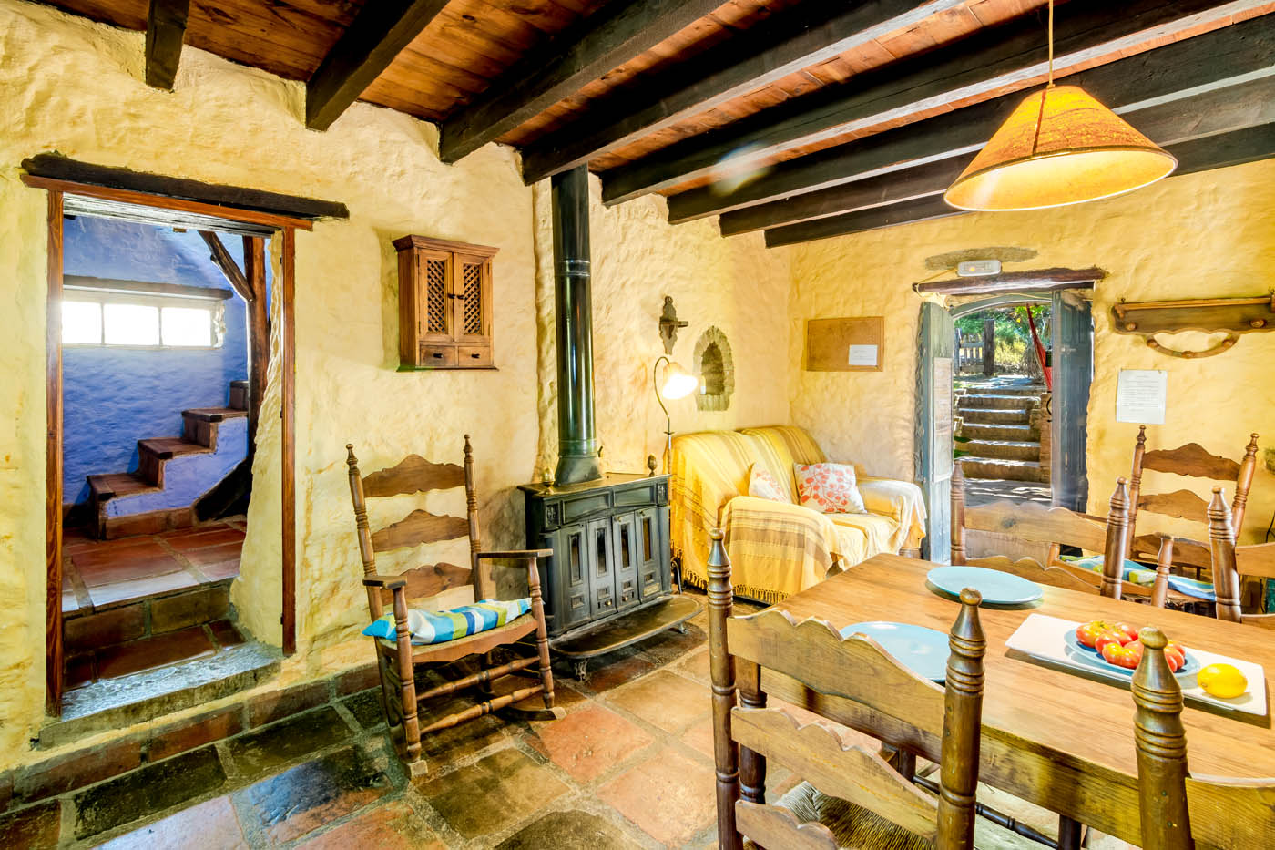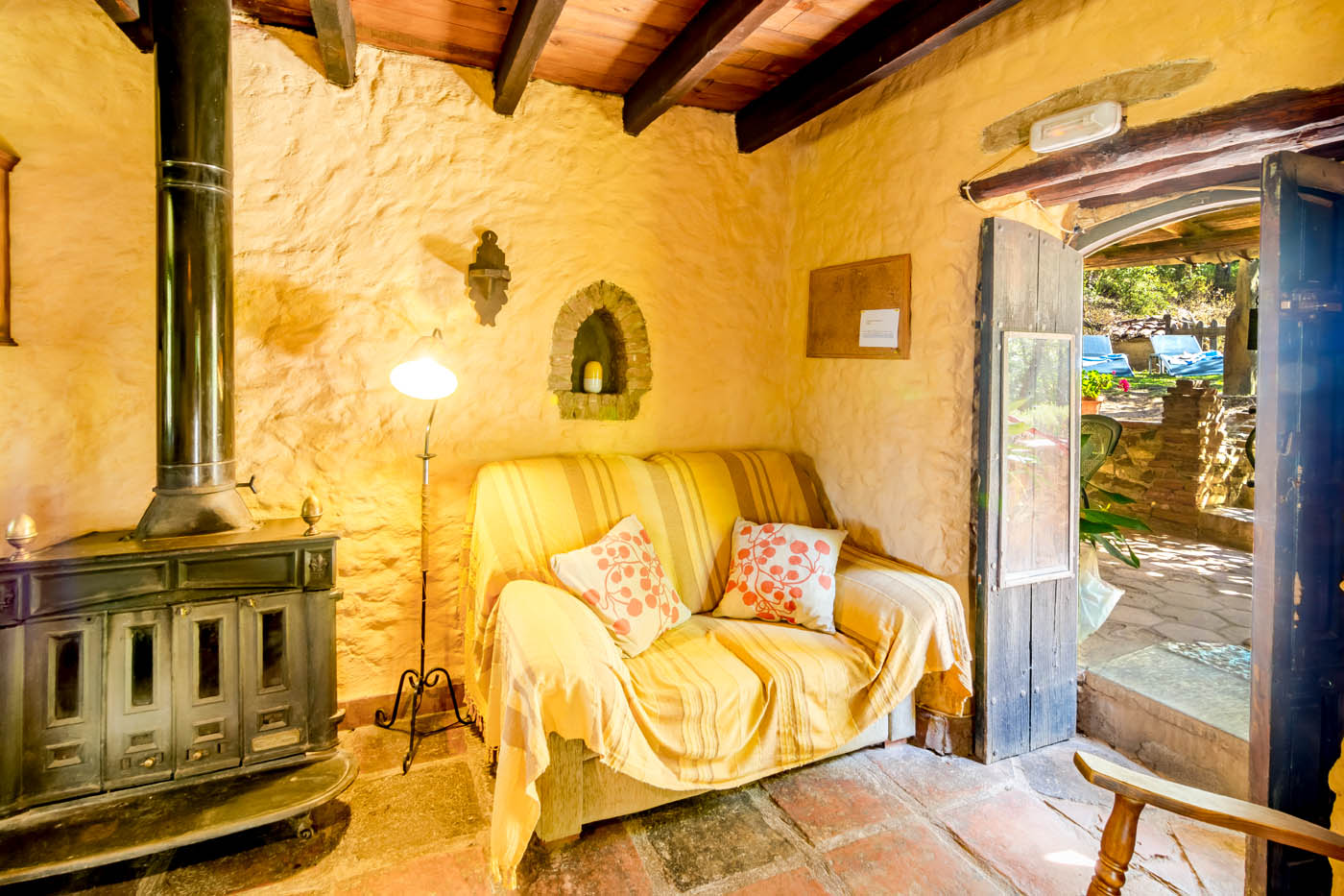 La casa tiene su propio carácter íntimo, con techos y suelos de madera, y baldosas de terracota. Está amueblada de forma sencilla, con algunos toques originales en la decoración, que la convierten en muy acogedora. Las instalaciones también son sencillas. Las ventanas llenan de luz la parte superior y ofrecen vistas al hermoso campo.