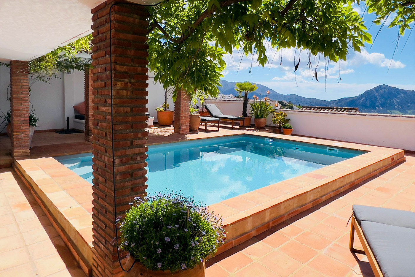 Los rayos del sol del mediodía andaluz le llevarán a la terraza de abajo con la piscina particularmente sugerente, ¡otro lujo más en una casa de pueblo de este tipo! Al ser una casa de pueblo, no podemos presumir de total privacidad como en un cortijo, pero hay suficientes rincones como para disfrutar sin ser visto.