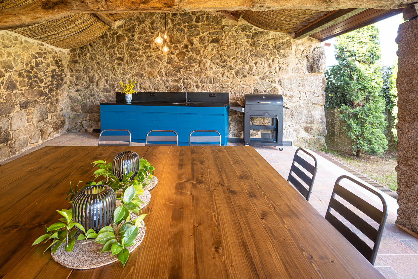 Es precisamente la amplitud de los espacios interiores lo que más nos llamó la atención en nuestra visita a esta casa tradicional de piedra gallega. El elegante salón que cuenta con techo acristalado es un espacio alegre y acogedor. El porche exterior con mobiliario y zona de relax tampoco desmerece mencionarse como un espacio irresistible para disfrutar en familia o con amigos.
