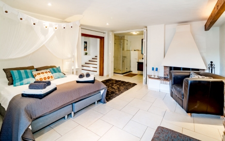 Bedroom 1: Master Suite with double bed, private balconies, en-suite bathroom with spa tub, and open fireplace