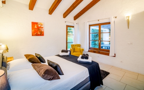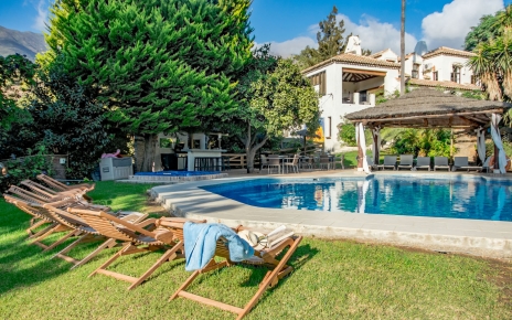 This stunning, private countryside estate certainly has the wow factor! High wood beamed ceilings welcome you to the bright and airy floor plan surrounded by lush, well-maintained gardens with sprawling lawns and panoramic mountain views. The property features 2 swimming pools, jacuzzi, sauna and plenty of covered terraces and garden areas to enjoy the Mediterranean sunshine. Sleeps up to 20 people.