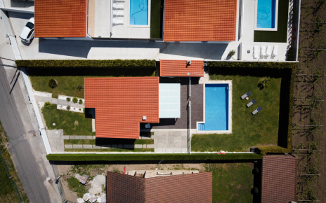 The house has a front door from parking area and also a direct door to terrace / pool area.