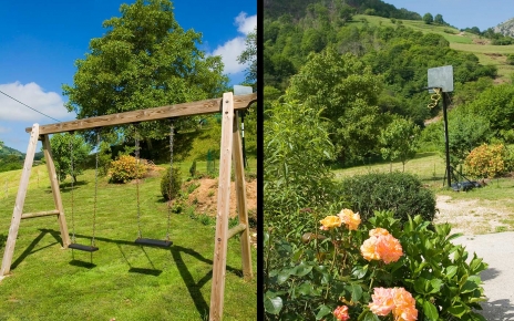 The gardens are lush and green, planted with colourful flowering shrubs, and there are swings and a basketball hoop for children. Apple trees, hazelnut, cherry, walnut, chestnut, peach and fig trees complete the picture. The gardens are not fenced off and partly shared with anyone staying in another cottage nearby.
